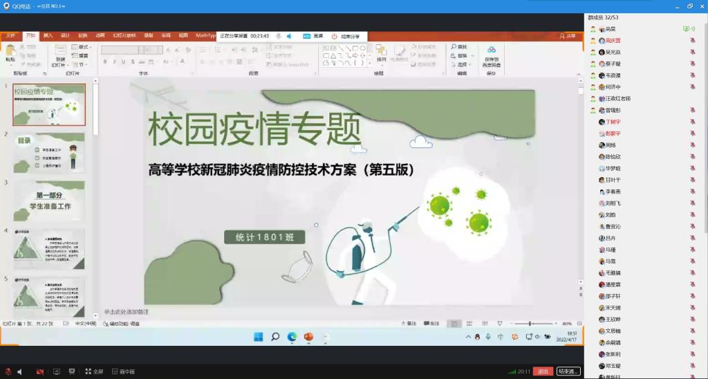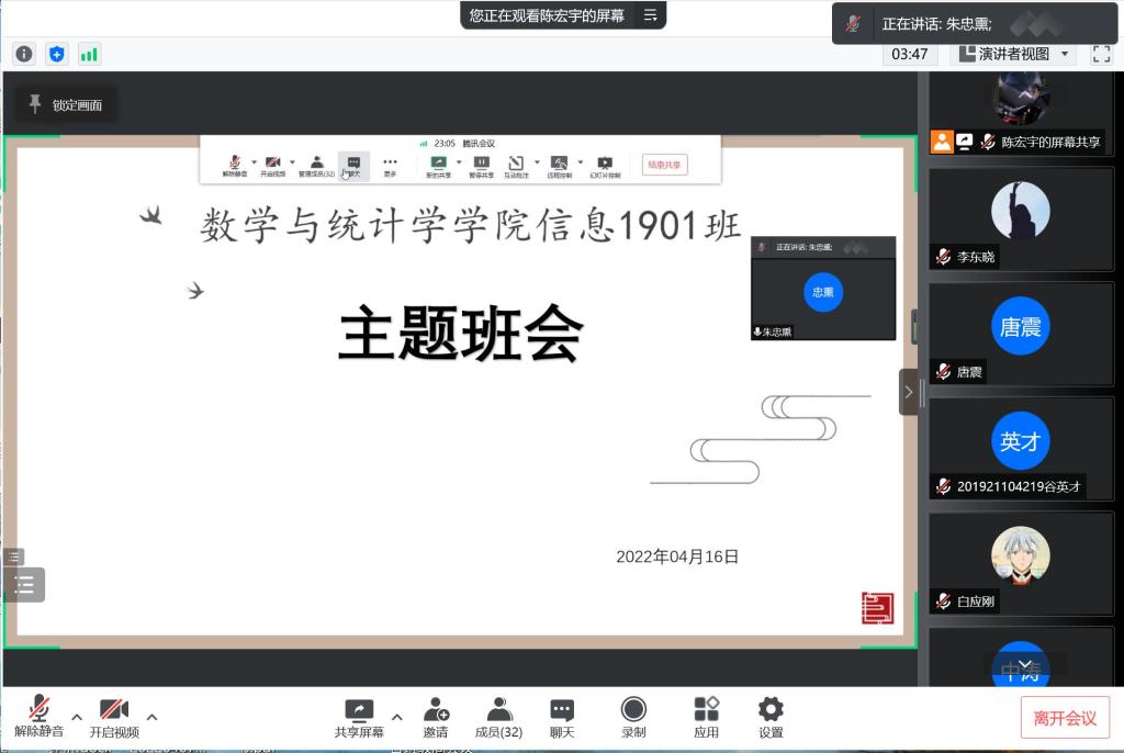 2022年4月16日至17日,數學與統計學院各班分別于線上線下舉辦“疫情防控”主題班會。各班班導師及全體學生參加班會活動。