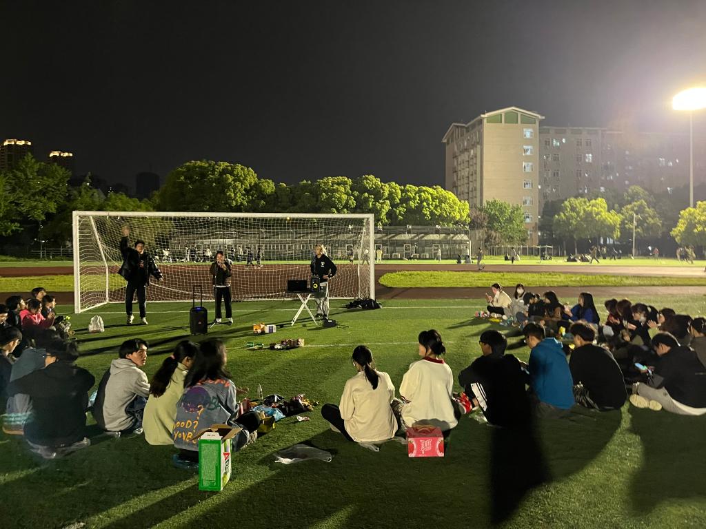 活動大致分為自我介紹、才藝展示、互動游戲和獎品兌換四個環節,但兩個團支部的活動又各具特色。應數團支部的團建活動舉辦地點在南區操場,大家圍圈席地而坐,并邀請了DJ嘉賓全程伴奏,氛圍感拉滿。在互動游戲環節,123木頭人、你畫我猜等多種游戲都緊跟當下年輕人的潮流,讓每一位同學都參與其中。其中游戲懲罰環節,更是有“廣西科目三”、“擦玻璃”等熱門舞蹈的展示,引得大家掌聲不斷。大數據團支部邀請了班導師賈小英老師和輔導員朱浩軍老師參與班級團建,并讓兩位老師加入分組游戲與大家同樂。大數據把所有同學分成七個小組,整個游戲過程分為傳聲筒、競猜歌名、數字問答、線傳乒乓等4個小游戲,各個小組贏得比賽后將獲得相應積分,最終獲勝的前兩組將獲得精美禮品。活動最后,賈老師總結到,本次活動她感受到了大數據學生的青春與活力,即便當下受疫情影響,大家也可以在這段抗疫時光里收獲難能可貴的美好的大學友情。