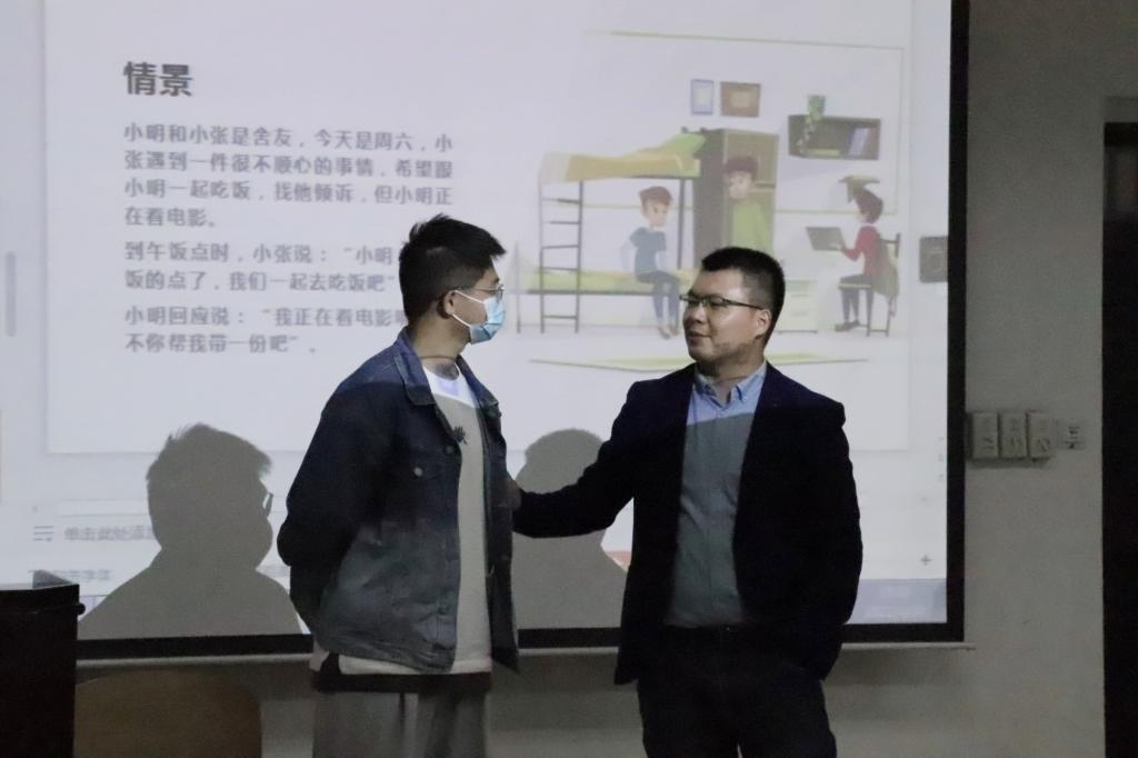 隨后,關于大家最關心的如何處理宿舍人際關系問題,余金聰博士提出了八條建議。在環境層面,他建議通過美化宿舍、及時打掃衛生來營造整潔的宿舍環境。在集體層面,他提倡積極組織宿舍集體活動,共同商議制定宿舍合約。在個體認知層面,他呼吁大家培養積極認知問題的思維,在發生問題時利用沖突構建關系,有必要時及時向心理中心及心理服務熱線尋求專業幫助。在關于如何保持有效的溝通這個問題上,余金聰博士邀請學生上臺互動,展示了討好型、超理智型、一致型、指責型、打岔型五種溝通方式,引導大家應用不同方式應對不同情景下的人際關系問題,并深入淺出地向大家分享了一致型溝通方式的具體步驟。除此之外,余金聰博士還貼心地向同學們推薦了心理學延伸參考資料供大家進一步學習。