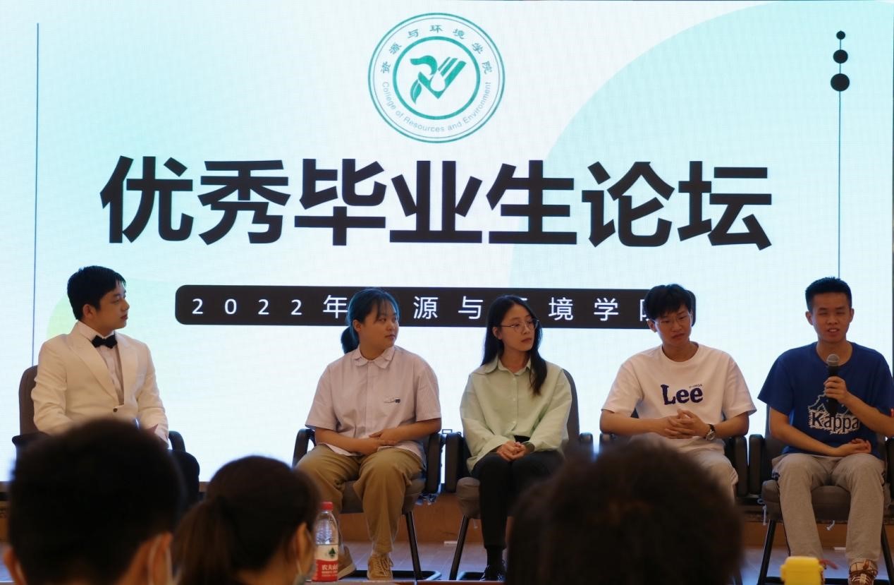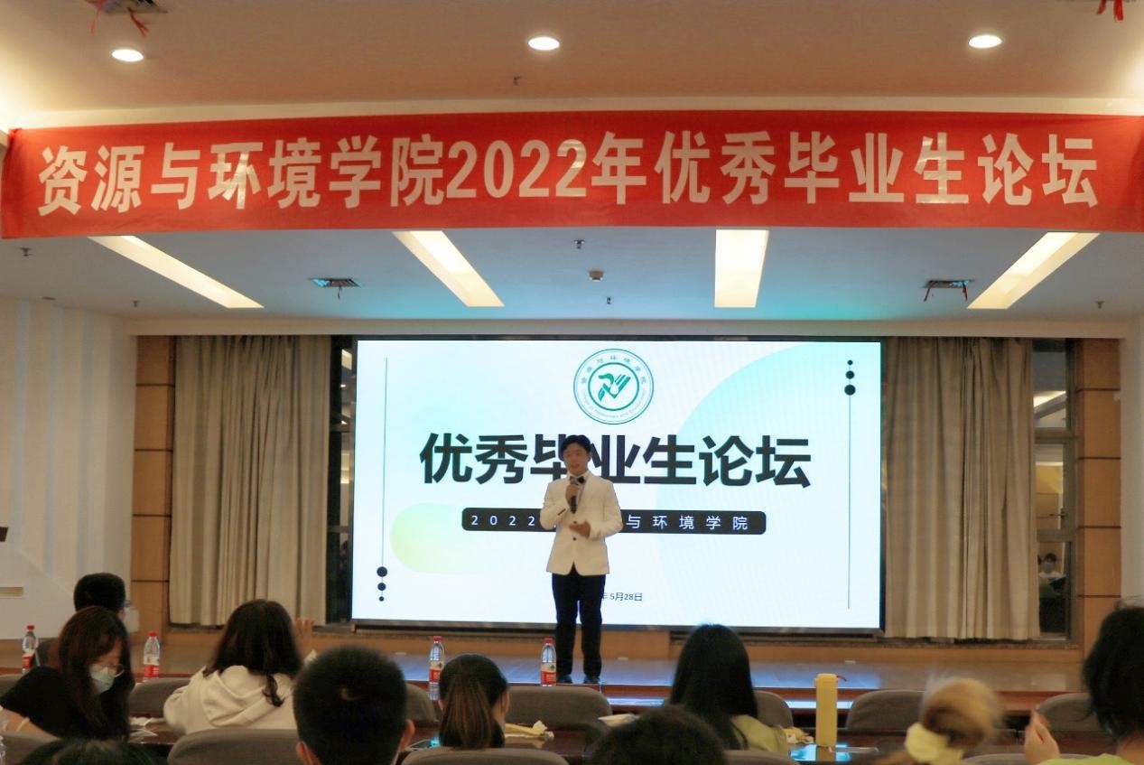 雙子塔下話別離,資環學子展意氣。5月28日晚,資源與環境科學學院在潤良報告廳舉行2022年優秀畢業生論壇。學院黨委副書記黃本金、團委書記黃晴出席活動。段語嫣、歐哲順等八位優秀畢業生分享了自己的成長故事和考研、就業經驗。本次論壇由樸旭瑞同學主持。