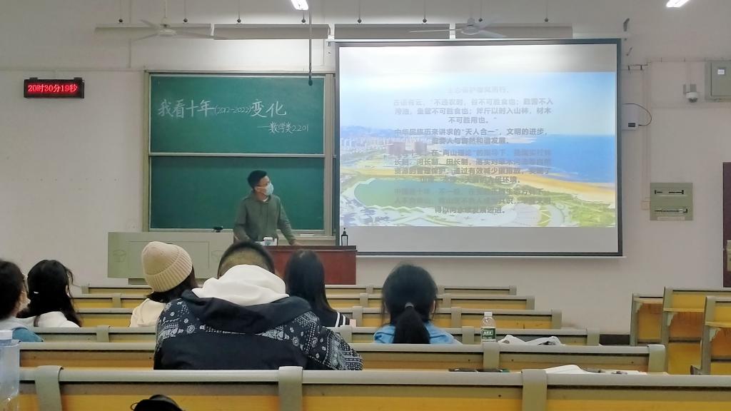 數(shù)學(xué)類2201班的韓胡賽同學(xué)以自己的家鄉(xiāng)青海為例,向同學(xué)們介紹了青海省的生態(tài)文明建設(shè)成果。建設(shè)生態(tài)文明,關(guān)系人民福祉,關(guān)乎民族未來。十年來,黨中央始終秉承著“綠水青山就是金山銀山”的堅(jiān)定信念,黨的十八大把生態(tài)文明建設(shè)納入中國特色社會(huì)主義事業(yè)五位一體總體布局,明確提出大力推進(jìn)生態(tài)文明建設(shè),努力建設(shè)美麗中國,實(shí)現(xiàn)中華民族永續(xù)發(fā)展。這標(biāo)志著我們對(duì)中國特色社會(huì)主義規(guī)律認(rèn)識(shí)的進(jìn)一步深化,表明了我們加強(qiáng)生態(tài)文明建設(shè)的堅(jiān)定意志和堅(jiān)強(qiáng)決心。