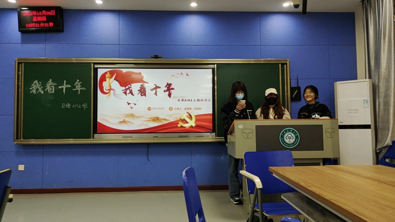 日語2102班的同學輪流展開主題演講,在自由發言中暢談近十年來發生在自己身邊的變化,班級全體成員全程參與,暢談切身感受;商英2101班班導師則倡導同學們要做常懷愛國之心的新時代青年大學生。