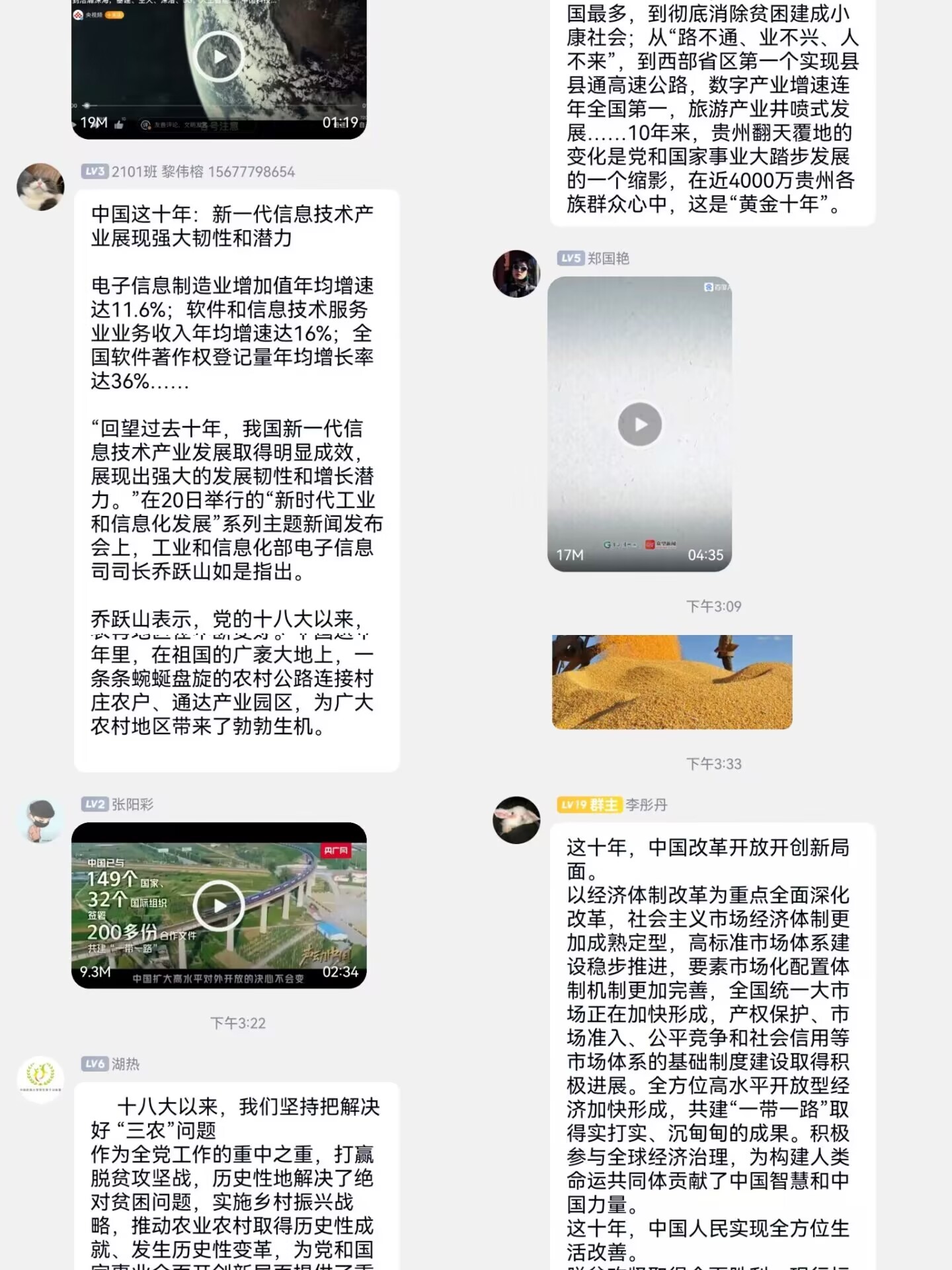 教育技術2101班、教育大類2202班同學在觀看視頻后,以自身經歷為例,通過講述家鄉的十年變化,以小見大,感受我國科學、文化、技術的進步,表示要堅決擁護中國共產黨的領導,把為民族謀復興、為人民謀幸福歸入自己人生的價值追求和崇高理想中,與中華民族偉大復興的進程同頻共振。