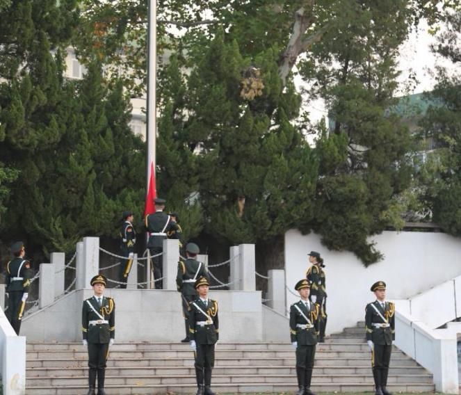 7點整,升旗儀式正式開始。在全體同學(xué)的注目下,國旗護(hù)衛(wèi)隊隊員們護(hù)送五星紅旗進(jìn)場,伴隨著莊嚴(yán)的《中華人民共和國國歌》,五星紅旗在南湖操場國旗臺上冉冉升起。