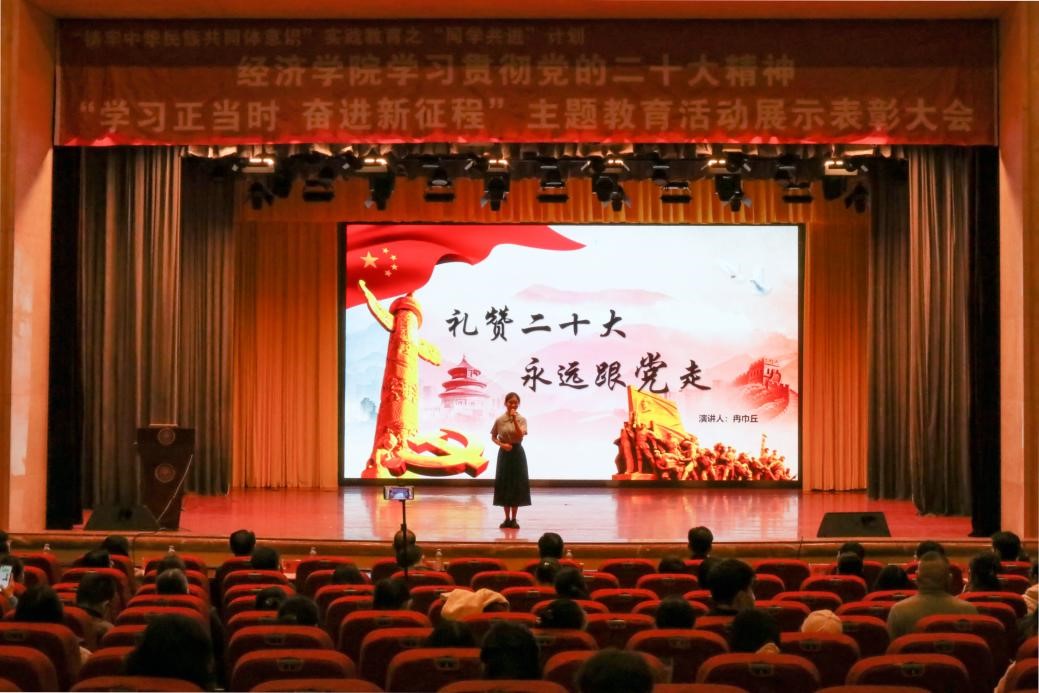 會議播放了“同學共進”計劃主題教育成果視頻,充分展示經濟學院鑄牢中華民族共同體意識教育和學風建設成效;邀請學生代表凡詩軒分享大學生生涯規劃,體現了2022級新生對“轉變角色、找準方向”和生涯規劃的深度思考;展示“喜迎二十大 執筆著華章”主題征文比賽優秀參賽作品,并邀請“喜迎二十大 有話對黨說”主題演講比賽獲獎學生代表冉巾丘上臺演講,鼓勵全體同學堅定不移跟黨走,以昂揚精神為黨的二十大獻上青春禮贊。隨后,參會領導和教師為2022-2023學年秋季學期“最美筆記”大賽、2021-2022學年“晚自習聯盟”、2021-2022學年“志在同學,愿與共進”學業幫扶活動、2022級大學生涯規劃分享活動、“喜迎二十大 執筆著華章”主題征文比賽以及“喜迎二十大 有話對黨說”主題演講比賽獲獎學生頒獎。
