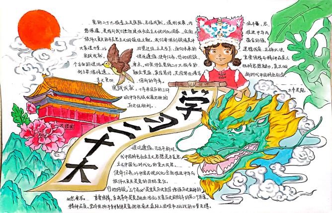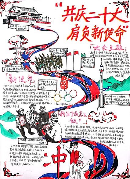 此次比賽共收到近200份作品,同學們以手抄報為媒介分享了研讀黨的二十大報告、學習黨的二十大精神的心得體會,用蠟筆、馬克筆、水粉筆、碳素筆等工具描繪出令人憧憬的中國式現代化新畫卷。
