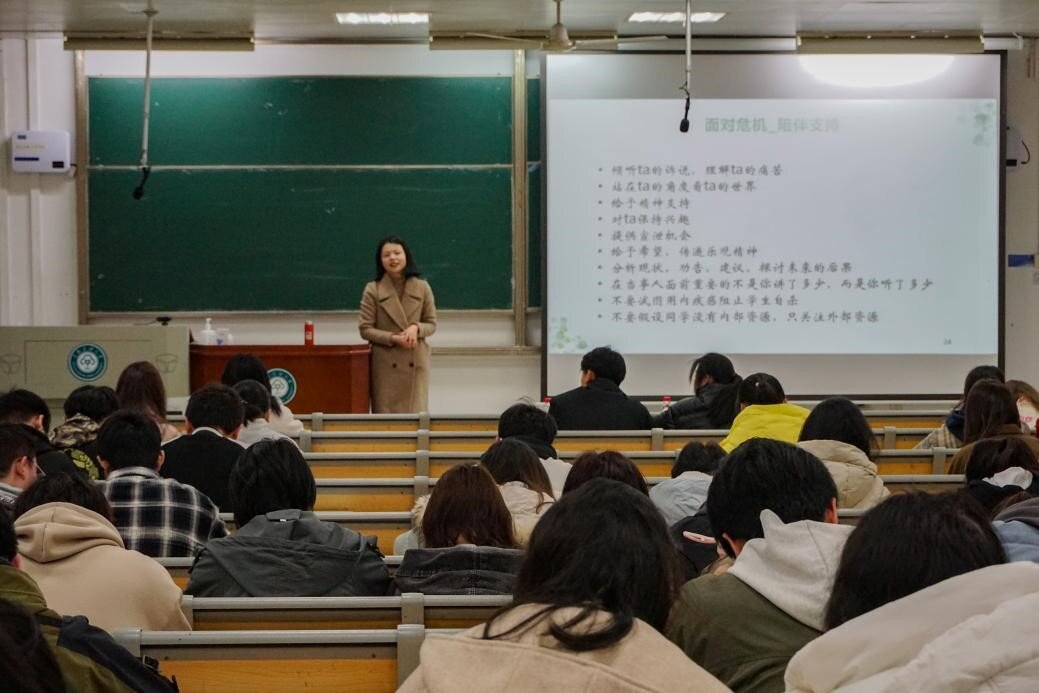 章吉圍繞“認識‘心’危機,守護身邊人”的主題,詳細講解了心理委員和寢室長的職責以及做好心理危機干預的具體方法。她結合豐富的事實案例,從普及基礎的心理健康知識、積極談心談話、適時組織班級心理健康活動、及時發現并協助輔導員做好危機干預工作四個方面指導了心理委員的工作,強調心理距離近、信息來源廣、教育效果好和自我成長快是心理委員及寢室長進行危機干預的優勢。章吉重點介紹了自殺危機干預的相關知識,從言語、情緒、行為三個方面說明自殺的前期征兆與線索,糾正了有關自殺的錯誤觀念,進一步解釋了為何干預、如何干預的問題。她鼓勵心理委員和寢室長們密切關注可能面臨心理危機的學生,做到立即報告、防范監護和陪伴支持。