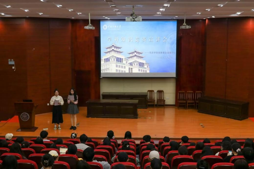 為營造良好的賽事活動氛圍,提高同學們的綜合實踐能力和創新意識,4月9日晚,經濟學院在模擬法庭舉辦了學科知識競賽宣講會。經濟學院學生工作辦公室主任安樹庭出席此次會議,2019級優秀學生代表楊瑋麗、文硯江、馬子祺進行競賽宣講,2020級至2022及學生代表現場參加。會議由2022級彭文香、張婧同學主持。