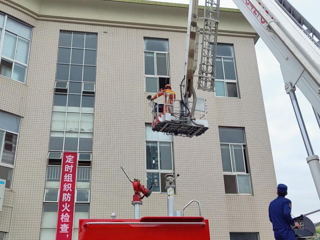 隨后,消防部隊用煙霧發生劑模擬火災現場,迅速進行判斷著火點,水槍降溫,救出被困人員,云梯登高解救高處被困人員,依靠水罐消防車對建筑周體大規模降溫滅火。一系列動作行云流水,觀演師生也懂得了消防出警滅火相關流程,起火后如何自救自護,以及高處被控人員如何求救,讓消防人員快速發現自己被困位置。
