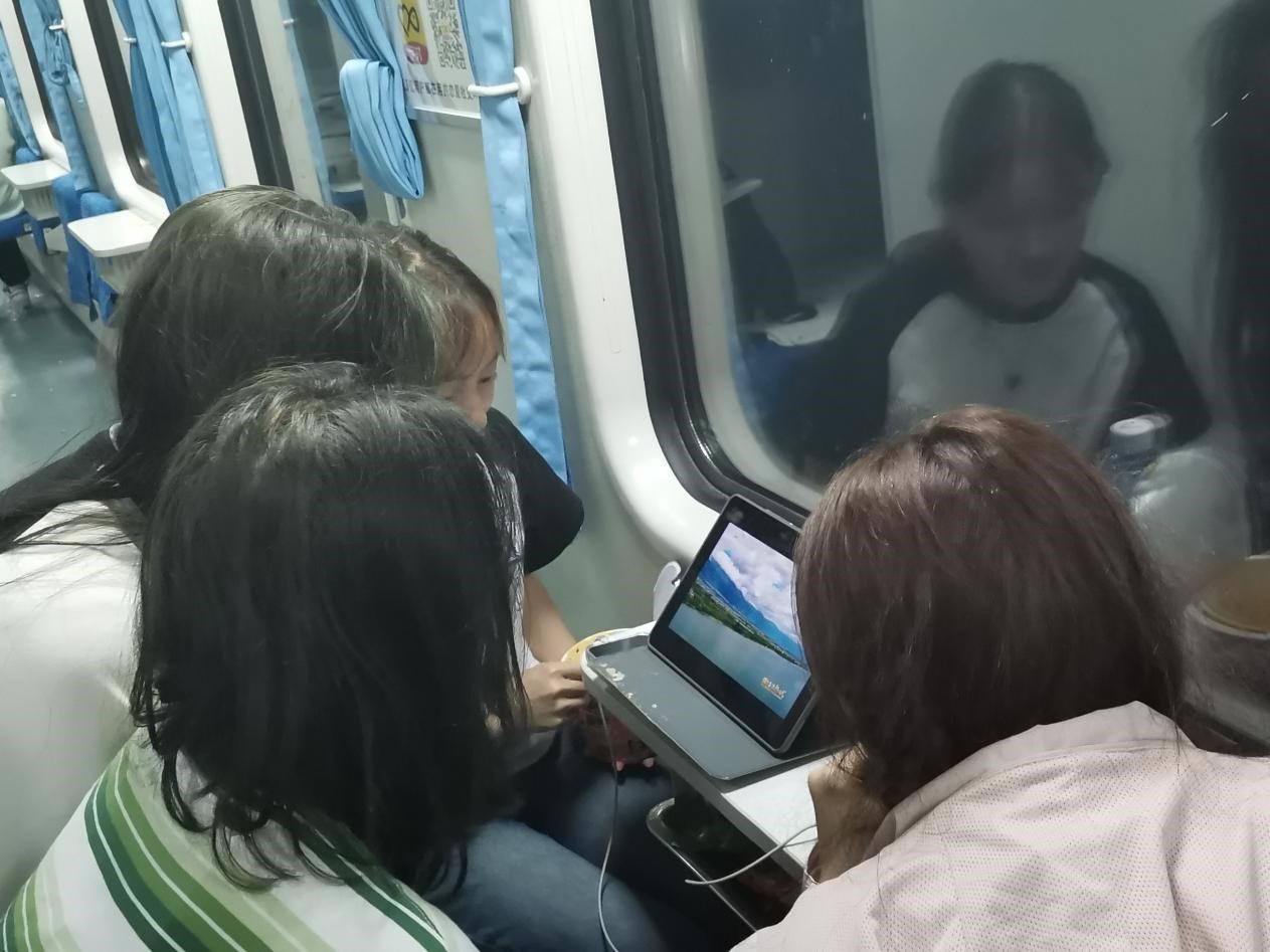 同學們在返校途中收聽收看“團結奮進新時代——第十批全國民族團結進步示范區示范單位授牌活動”特別節目直播。 學生工作部 供圖