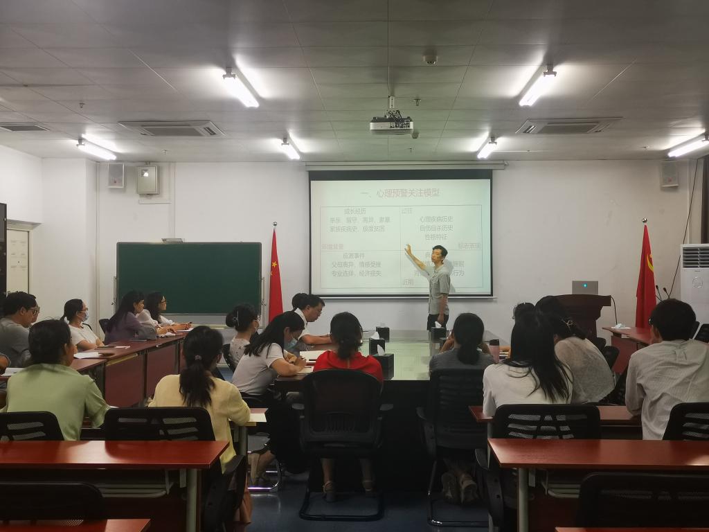 嚴亮老師結合長期從事心理健康教育工作的經驗做法,以“班導師如何快速上手心理危機識別工作”為題,從“心理預警關注模型”“對學生過往背景的了解”“及時發現心理異常的線索渠道”和“如何處理心理危機問題”等4個方面分享了心理健康教育工作的要點和方法,詳細介紹了“心理異常學生的共同特點”“心理異常的三個層級”“心理危機的三個階段”和“三種常見的心理疾病”,幫助班導師掌握心理問題識別與處置的方法和策略。答疑互動環節,嚴亮老師認真解答了班導師提出的日常工作中遇到的心理危機問題。