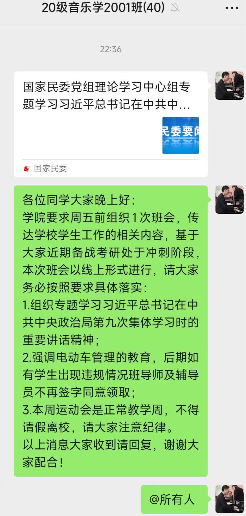 班導(dǎo)師陳凱組織畢業(yè)班同學(xué)在線上學(xué)習(xí),重點(diǎn)強(qiáng)調(diào)要深刻理解鑄牢中華民族共同體意識是黨的民族工作、民族地區(qū)各項(xiàng)工作的主線,切實(shí)立足中華民族悠久歷史,加強(qiáng)中華民族共同體理論體系建設(shè) ,大力宣介中華民族共同體意識。