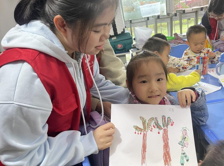 第三個活動是合作繪畫。小朋友們在紙張上揮舞著自己的畫筆,向志愿者們展示了他們的繪畫功底,與志愿者一起完成了許多好看的畫作。小朋友們說:“很喜歡哥哥姐姐們,他們幫我拿畫筆,幫我畫畫,我很開心!”志愿者們也非常熱情地加入小朋友們的隊伍中,與他們一起完成這一項活動。