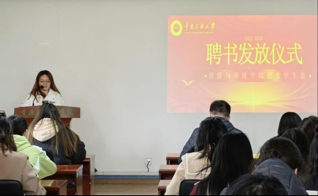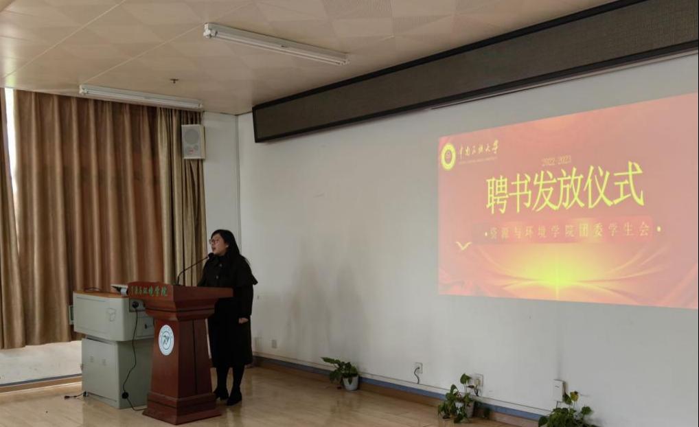 11月16日,資源與環(huán)境學(xué)院于13棟教學(xué)樓舉行了2022屆團(tuán)委學(xué)生會成員聘書頒發(fā)儀式。學(xué)院黨委書記劉子元、副書記藍(lán)永麗、學(xué)工辦主任黃晴、院團(tuán)委副書記王瑩瑩以及22、23屆團(tuán)委學(xué)生會成員參與了此次活動。儀式由團(tuán)委學(xué)生會黃秋實(shí)主持。