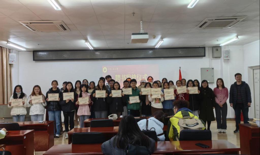儀式最后,藍(lán)永麗副書記、黃晴老師、王瑩瑩老師為22屆團(tuán)委學(xué)生會成員頒發(fā)聘書并合影留念。