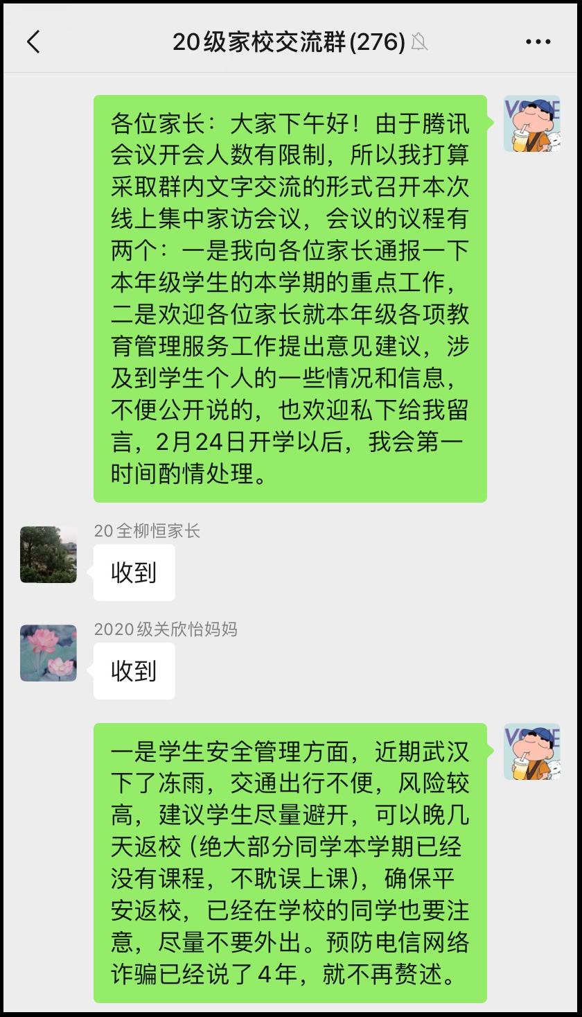 為推進公共管理學院畢業年級工作深入開展,持續加強家校聯合育人工作,2月22日,20級輔導員師軍強老師在家校交流微信群召開了線上集中家訪工作會議,20級本科生全體家長參加會議。本次線上家訪會議分為兩個議程,一是2020級專職輔導員師軍強向全體家長介紹和通報了2020級本科生在本學期的重點工作,二是與會家長對2020級的各項教育管理服務工作提出意見和建議。