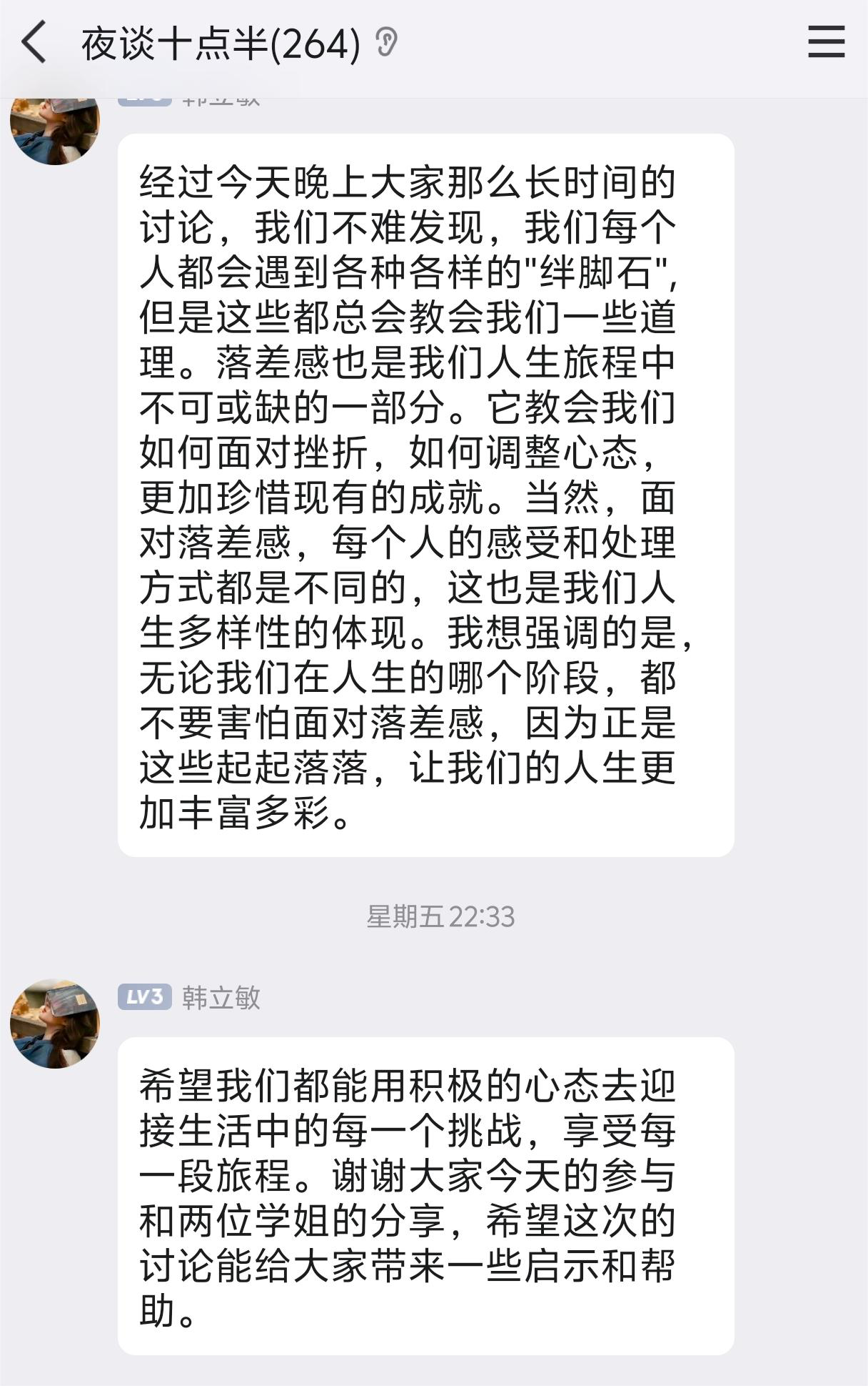 “夜談十點半”活動為同學們提供了一個緩解心理壓力和解決心理問題的平臺,在學長學姐的經驗分享中,在同學們的積極討論下,大家的疑惑得到解答,并走向了正確的心理健康道路。我們更加希望“夜談十點半”活動是宣傳隊,是播種機,讓該理念能夠更好地在同學中傳播,成為同學們解決心理健康問題的途徑,同時也歡迎同學們積極參與到活動中。