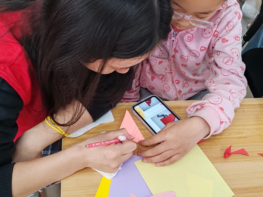 隨后,志愿者對剪紙作品進行了演示,詳細講解了折紙及剪紙的要領和技巧,幫助小朋友們對剪紙的手工制作步驟有大致的了解,同時志愿者們對小朋友進行一對一的指導與幫助。一番講解過后,小朋友們紛紛一臉期待,迫不及待想要親自體驗剪紙。接下來,便到了激動人心的剪紙環節!