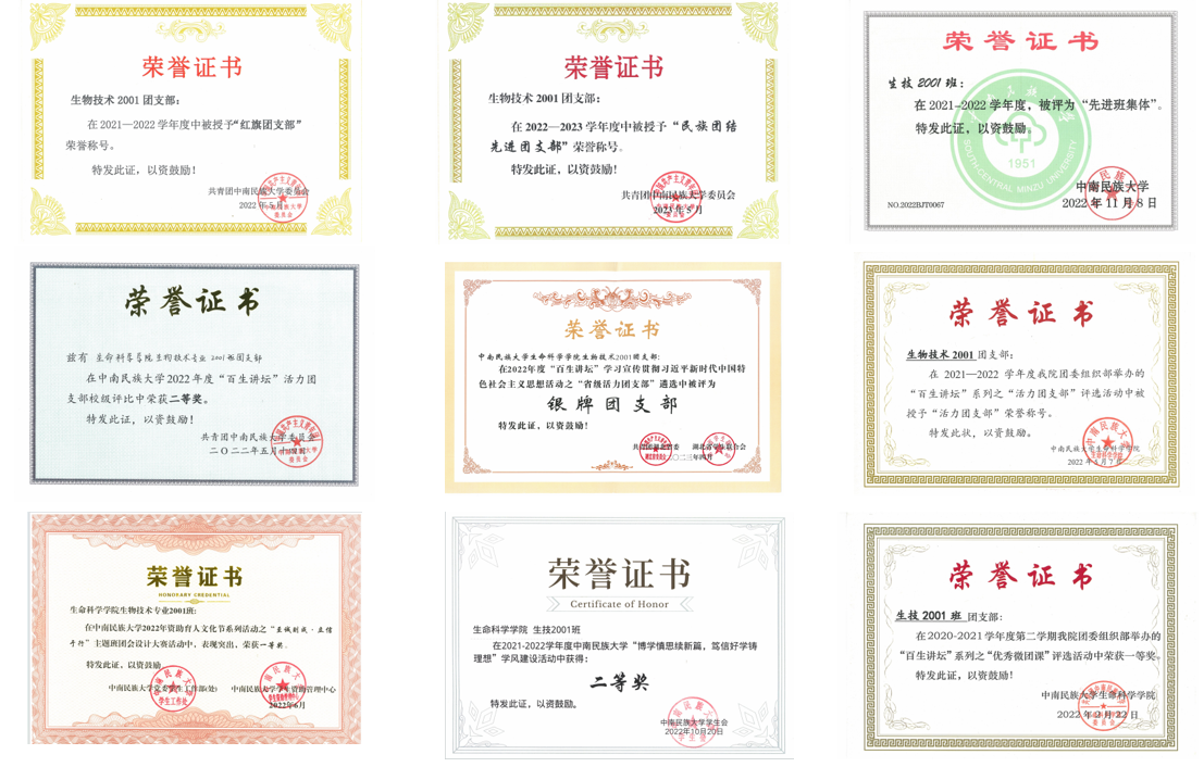 生物技術(shù)2001班榮譽證書 生物科學學院提供