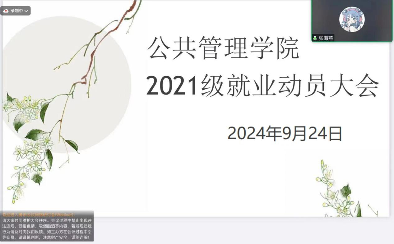 為促進我院大四本科生充分了解就業形勢,引導同學們進行合理就業生學規劃,助推高質量就業,公共管理學院于9月24日在線上召開2021級就業動員大會。本次大會由2021級輔導員張海燕老師擔任主講人。