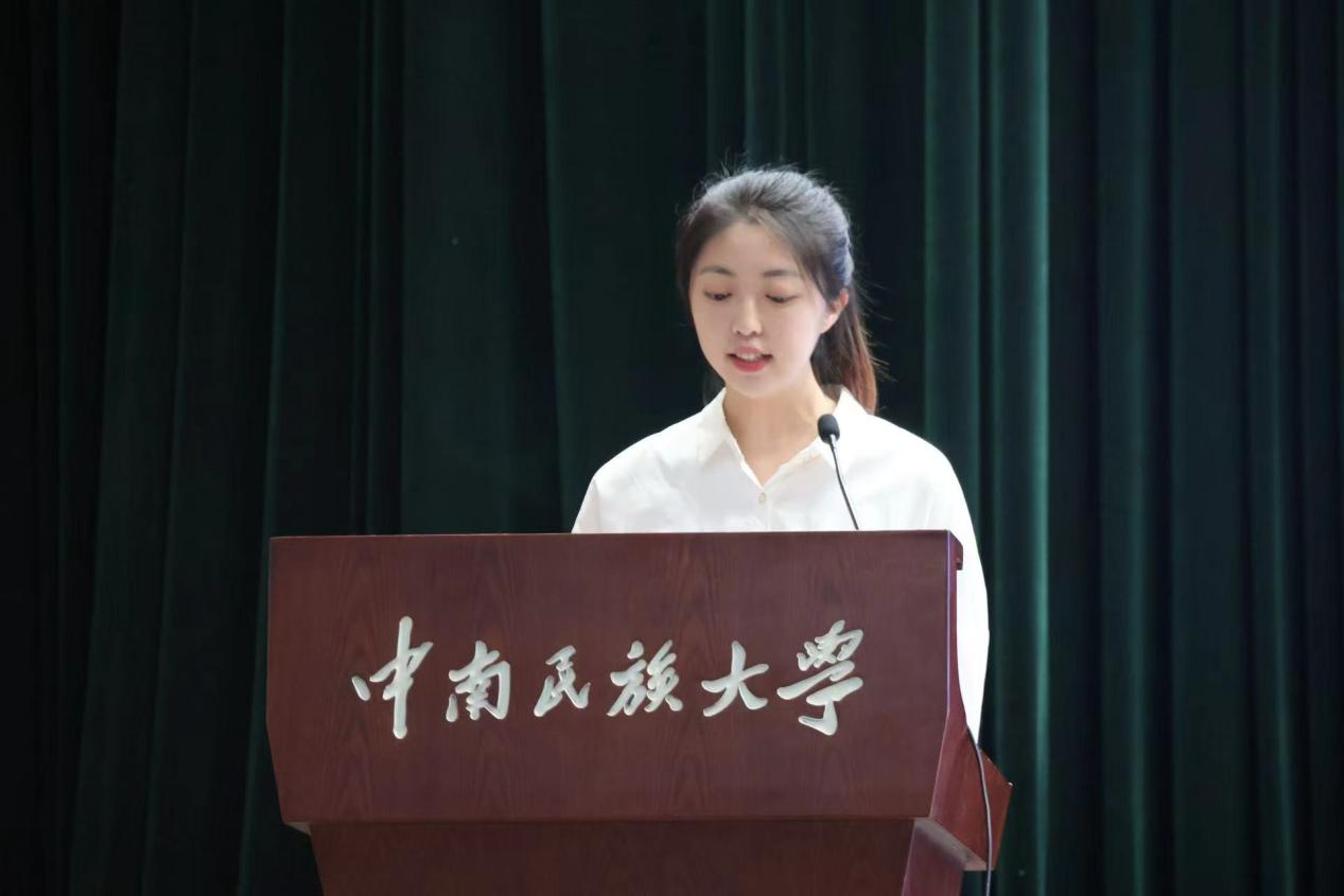 老生代表注會2101班黃曉琪發言。剛剛入選學校第二十七屆校研支團成員的她以“用理想做加法、用自律做減法、用奮斗做乘法、用豁達做除法”來號召學弟學妹們在大學中找尋目標,明確方向。