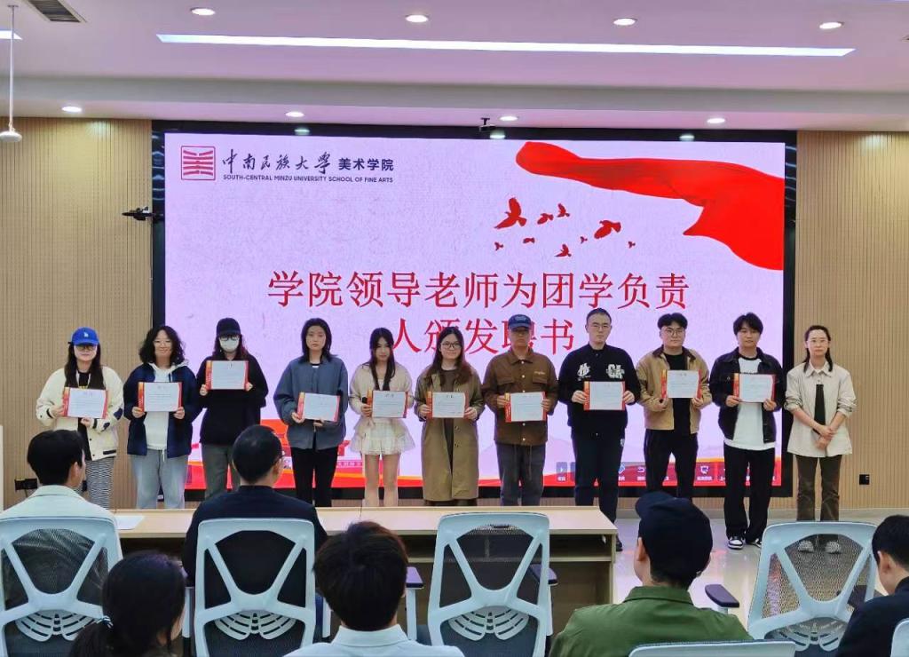 黨委副書記聶揚眉為團學主要負責人(右一)頒發聘書。 郝曉蕊 攝