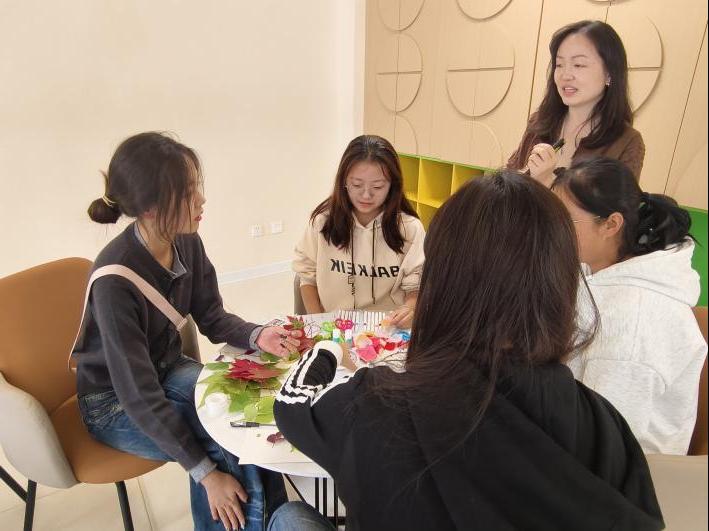 張雪花老師與學(xué)生交流手工的創(chuàng)意和想法 化學(xué)與材料科學(xué)學(xué)院 供圖