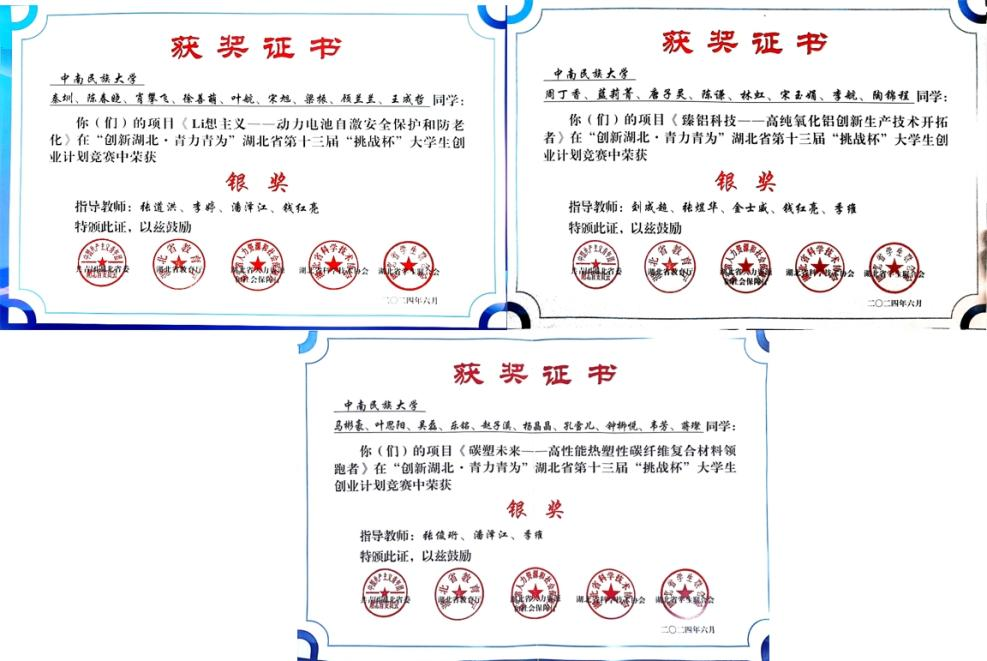 化學(xué)與材料科學(xué)學(xué)院學(xué)生“挑戰(zhàn)杯”中國大學(xué)生創(chuàng)業(yè)計劃競賽獲獎證書 化學(xué)與材料科學(xué)學(xué)院 供圖