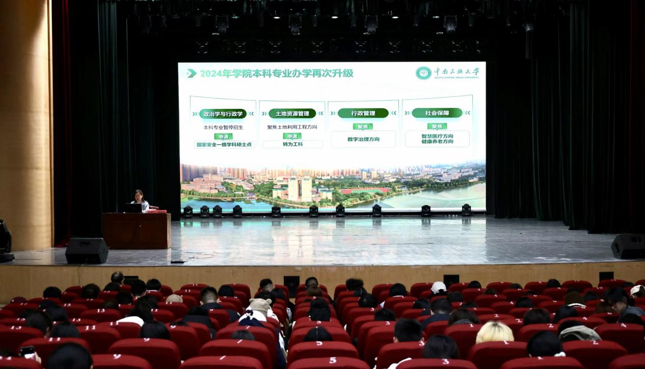 2024年11月26日晚19:00,預科教育學院在大禮堂舉辦了《中南民族大學本科專業介紹》系列講座第十一講——公共管理類本科人才培養與學科前沿進展。本次講座特邀公共管理學院副院長黃瑞芹教授主講。學院黨總支書記陳昌華,副書記、院長朱忠熏,副書記李忠賢,輔導員瑪依拉及預科教育學院2024級全體同學參加。