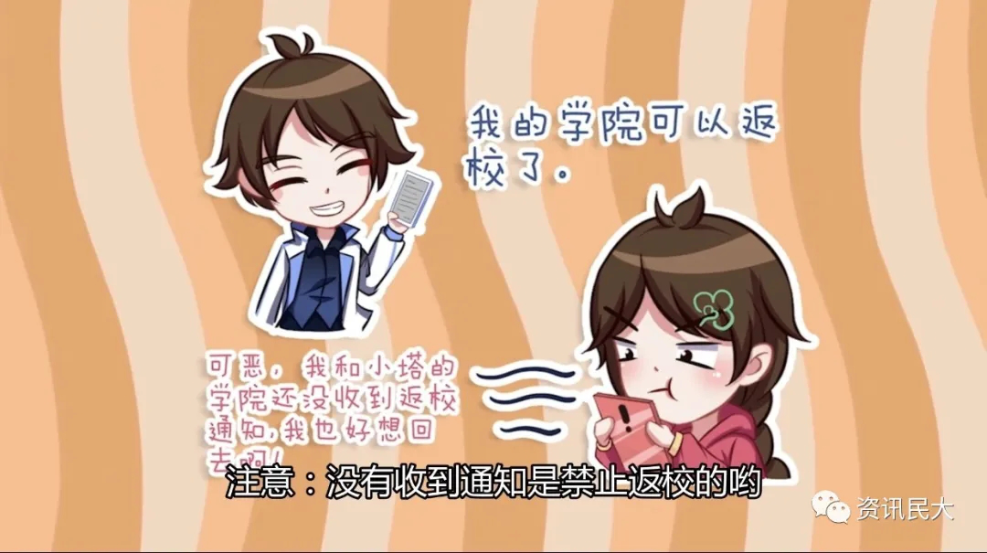 (學生返校 來源 咨詢民大) 返校后注意事項。 1.每日健康監測。校內布設了100多個測溫點,學生需定時到測溫點打卡,以保持校內健康碼為綠色。 2.配合校園封閉管理。疫情期間實行嚴格的校園封閉管理,各寢室學生不相互串門,辦完離校手續即可離校,離校后不能再次返校。 3.免費提供一日三餐。學生可以在宿舍領取免費一日三餐,用餐時注意保持距離。 4.個人防護。在校內公共區域和人員聚集場所,應佩戴口罩,回到宿舍及時洗手,加強宿舍通風,保持衛生。 5.暫停聚集性活動。疫情解除前,不召開學生聚集性會議,嚴禁聚集性拍照,暫停組織聚集性的校園文化活動,鼓勵開展多種形式的線上展示交流活動。 6.贈送學士服、畢業生紀念品。學校為畢業生準備了學士服和具有豐富校園文化特色的紀念品,由學院安排發放。 7.退住宿費。2020年春季學期住宿費全免,畢業生已繳費的退還學生本人,非畢業生等待具體通知。 8.畢業生送站。為了給畢業生提供溫馨、便捷的離校服務,學校提供免費送站服務。學生可在「返校申請」系統中提前填寫離校行程信息,提前預約送站車輛。