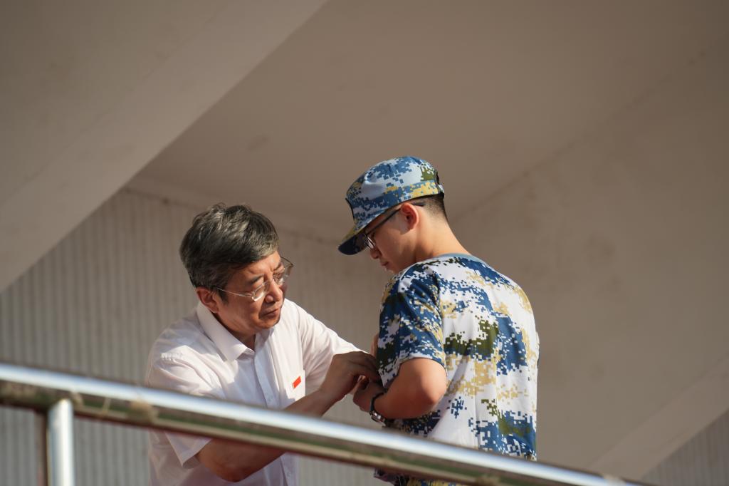 中南民族大學黨委書記邊境為黃天璣佩戴校徽,全體2022級學生共同佩戴起承載著使命與榮光的校徽,成為一名新“民大人”。