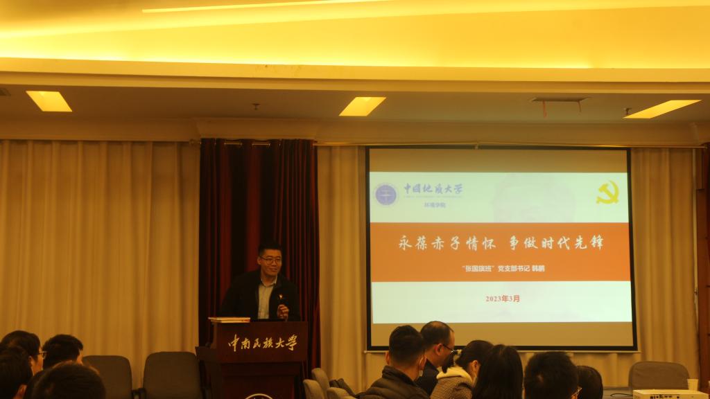中國地質(zhì)大學環(huán)境學院“張國旗班”黨支部成立于2017年, 于2022年入選教育部第三批“全國黨建工作樣板支部”培育創(chuàng)建單位。首先,“張國旗班”黨支部書記韓鵬以“永葆赤子情懷,爭做時代先鋒”做主題分享,他就“張國旗班”黨支部的旗幟精神、黨支部特色、黨支部建設、未來展望等幾個方面進行了詳細的介紹,并著重介紹了黨支部建設的“四個聚焦”,他引用了習近平總書記“愛國,是人世間最深層、最持久的情感,是一個人立德之源、立功之本”這一重要論述以及結(jié)合自身經(jīng)歷強調(diào)了黨支部建設加強凝聚力的重要作用。接著,孟慶達老師圍繞黨支部推動“一融雙高”建設在黨建工作中的重要性分享自身黨建及團學工作經(jīng)驗。分享結(jié)束后,輔導員老師們積極提問,并和“張國旗班”黨支部的老師和同學們進行了充分交流。