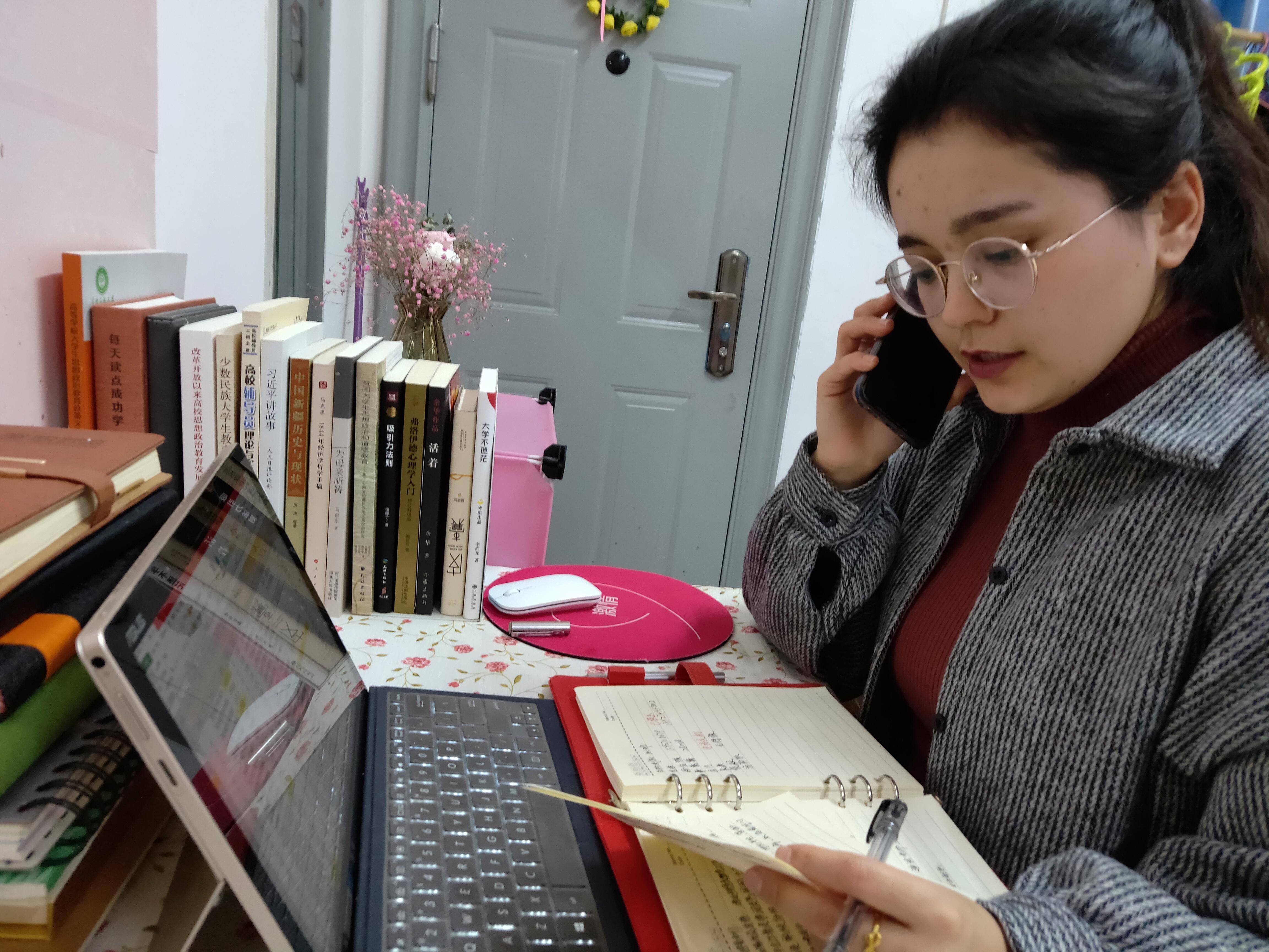 佐合熱“在線”辦公。 回想起當初留下來的原因:“因為我有留校的學生,這個時候,我要和學生在一起。”并沒有想到,佐合熱當時的那個決定成為了學生困難時候最堅強的后盾。 新時代對我們輔導員的素質與能力要求逐日提高,在疫情防控期間,佐合熱除了做好學生的聯絡工作,同時,抓緊時間學習了理論知識,提高政治素養,深化理論知識。