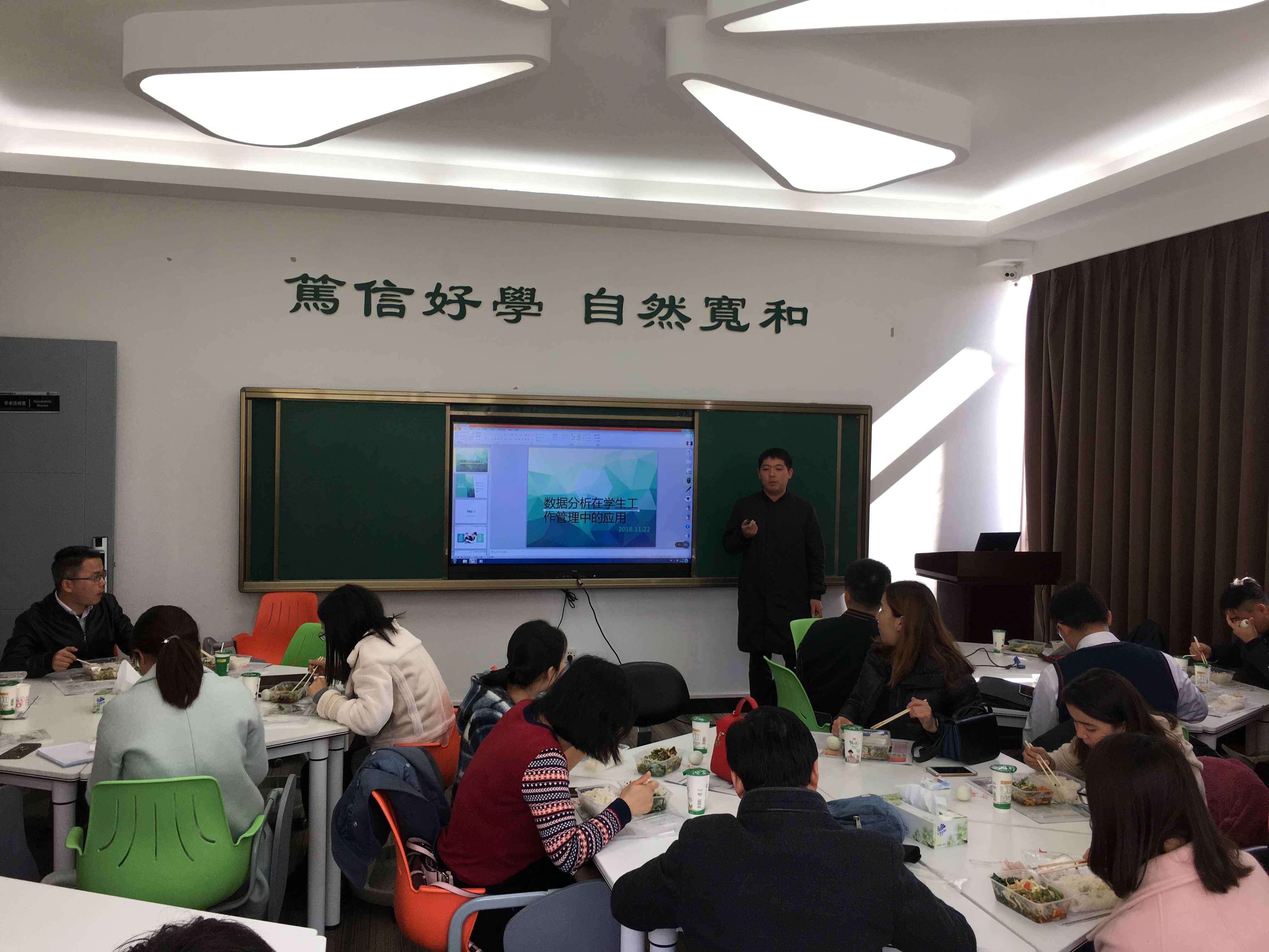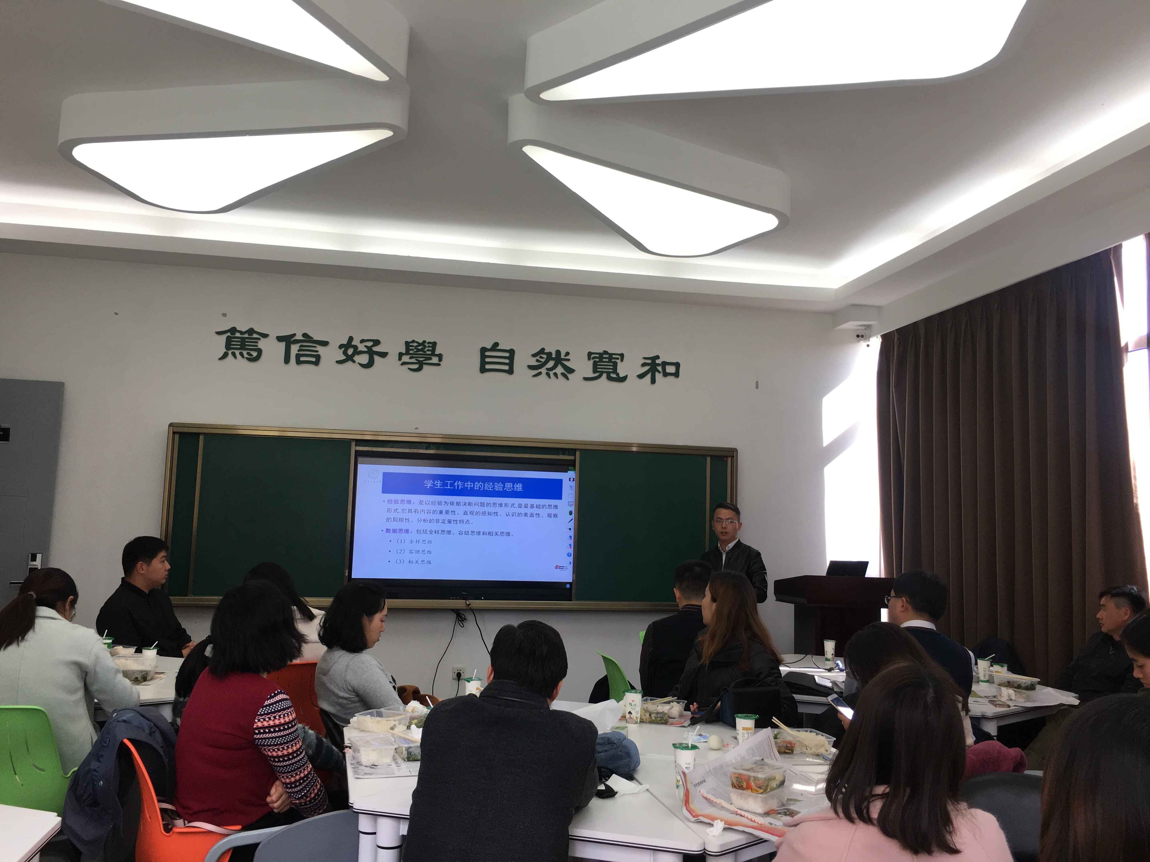 數(shù)字化和數(shù)據(jù)思維的區(qū)別在哪?我們在學生工作中運用的是經(jīng)驗思維還是數(shù)據(jù)思維?數(shù)據(jù)思維可以應(yīng)用在哪些場景?開場的幾個發(fā)問吸引住了老師們的注意力。從“大二為什么是學業(yè)倦怠期”“如何利用數(shù)據(jù)分析優(yōu)化學生工作”“如何從大量數(shù)據(jù)的定量分析升級為定性判斷并形成有效依據(jù)”等幾個學生工作中的涉及到數(shù)據(jù)分析的共性問題著手,兩位老師與大家分享了數(shù)據(jù)分析在學生工作管理中的應(yīng)用。 張帆老師結(jié)合近期參加的由麥可斯學院主辦的“2018年高校管理數(shù)據(jù)應(yīng)用分析培訓”的體會,談到如何建立起數(shù)據(jù)分析的思維、掌握問卷設(shè)計的基本方法、學會判斷數(shù)據(jù)質(zhì)量、了解各類數(shù)據(jù)分析中的常用方法、學習數(shù)據(jù)挖掘和數(shù)據(jù)解讀,最后是可視化的數(shù)據(jù)解讀與審美能力,幫助各位老師在實際工作中實現(xiàn)通過數(shù)據(jù)改進管理,開拓思路、獲取方法。安樹庭老師詳細介紹了模型在學生教育管理服務(wù)中的應(yīng)用,并通過一個小工具:基于Python的TOPSIS排序,現(xiàn)場演示了近百個數(shù)據(jù)包含的指標在不同的權(quán)重下的排序,并回答了其他輔導員老師在進行數(shù)據(jù)分析應(yīng)用于工作過程中遇到的問題,在場的老師們也表示收獲頗豐。