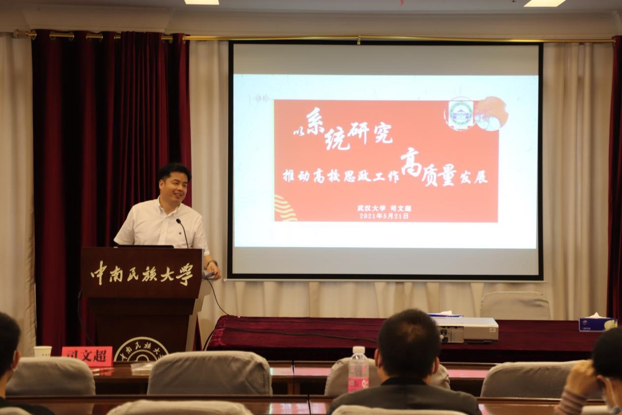 為加強輔導員工作交流研討,推動輔導員隊伍專業化職業化發展,提升我校學生工作質量,5月21日下午,由馬克思主義學院承辦的2021年輔導員工作培訓暨第5期“輔導員思享匯”(總第20期)于學術交流中心第一會議室舉行,武漢大學司文超博士應邀作了題為《以系統研究推動高校思政工作高質量發展》的專題報告。黨委學生工作部副部長鄧俊熙以及各學院輔導員參加本次活動。活動由馬克思主義學院黨委副書記梅喜萍主持。