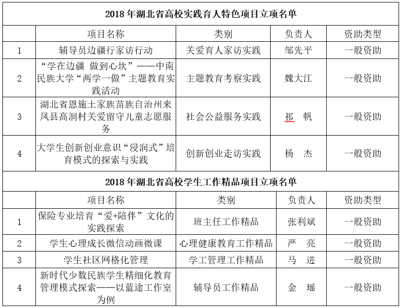 近日,湖北省教育廳公布了“2018年湖北省高校學(xué)生工作精品項目”和“2018年湖北省高校實踐育人特色項目”立項信息,我校8個項目獲批立項,其中4個項目獲批高校學(xué)生工作精品項目,4個項目獲批高校實踐育人特色項目。 近年來,學(xué)校高度重視輔導(dǎo)員隊伍建設(shè),把項目推動和精品培育作為提高隊伍素質(zhì)能力、提升工作品質(zhì)的重要抓手,鼓勵學(xué)工干部結(jié)合工作實踐開展研究探索,切實提升理論政策水平和實踐工作能力。2016年至今,我校學(xué)生工作項目獲得省級立項17項,初步形成了學(xué)生工作精品項目、特色實踐育人項目、思想教育主題活動項目、第二課堂專項教學(xué)項目等協(xié)同合力的項目平臺。 附:立項名單