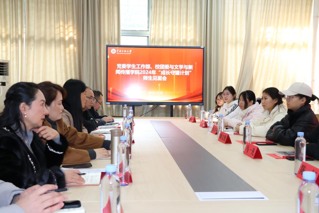 12月24日中午,黨委學(xué)生工作部、校團委聯(lián)合文學(xué)與新聞傳播學(xué)院,在大學(xué)生活動中心102會議室舉辦2024年“成長守望計劃”師生見面會。校黨委常委、副校長李紅燕,學(xué)工部、團委、文傳學(xué)院負責(zé)人,文傳學(xué)院24級新生輔導(dǎo)員以及相關(guān)師生參加活動,會議由文傳學(xué)院黨委書記謝嵐主持。