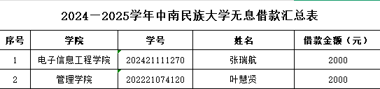 為進(jìn)一步做好我校學(xué)生資助工作,幫助部分孤兒、重度殘疾學(xué)生、遭遇意外傷害或患嚴(yán)重疾病學(xué)生等家庭經(jīng)濟(jì)特別困難學(xué)生減輕生活壓力,激勵他們刻苦學(xué)習(xí),順利完成學(xué)業(yè),根據(jù)《中南民族大學(xué)學(xué)費減免管理辦法(修訂)》(民大發(fā)[2024]91號)《中南民族大學(xué)校內(nèi)無息借款管理辦法(修訂)》(民大發(fā)[2025]10號)等文件要求,經(jīng)學(xué)生個人申請、學(xué)院初審、學(xué)工部學(xué)生資助管理中心審核后將2024—2025學(xué)年學(xué)費減免、無息借款意見報學(xué)校學(xué)生獎勵與資助工作領(lǐng)導(dǎo)小組審批通過,現(xiàn)將17名申請學(xué)費減免的學(xué)生及2名申請無息借款的學(xué)生名單公示如下: