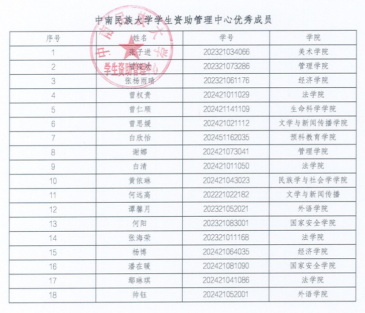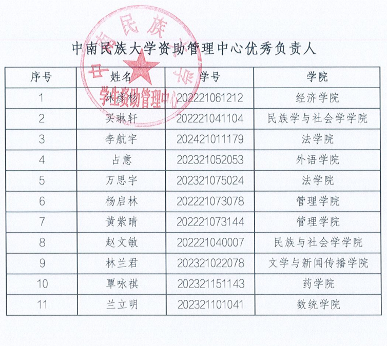 根據(jù)《中南民族大學(xué)學(xué)生資助管理中心學(xué)生團(tuán)隊先進(jìn)個人評選條例》,遵循公開、公平、公正的原則,經(jīng)個人申報、團(tuán)隊評選、學(xué)生資助管理中心審議等環(huán)節(jié),最終在4個團(tuán)隊中評選出優(yōu)秀負(fù)責(zé)人11名,優(yōu)秀成員18名,現(xiàn)將評選結(jié)果公示如下(排名不分先后):