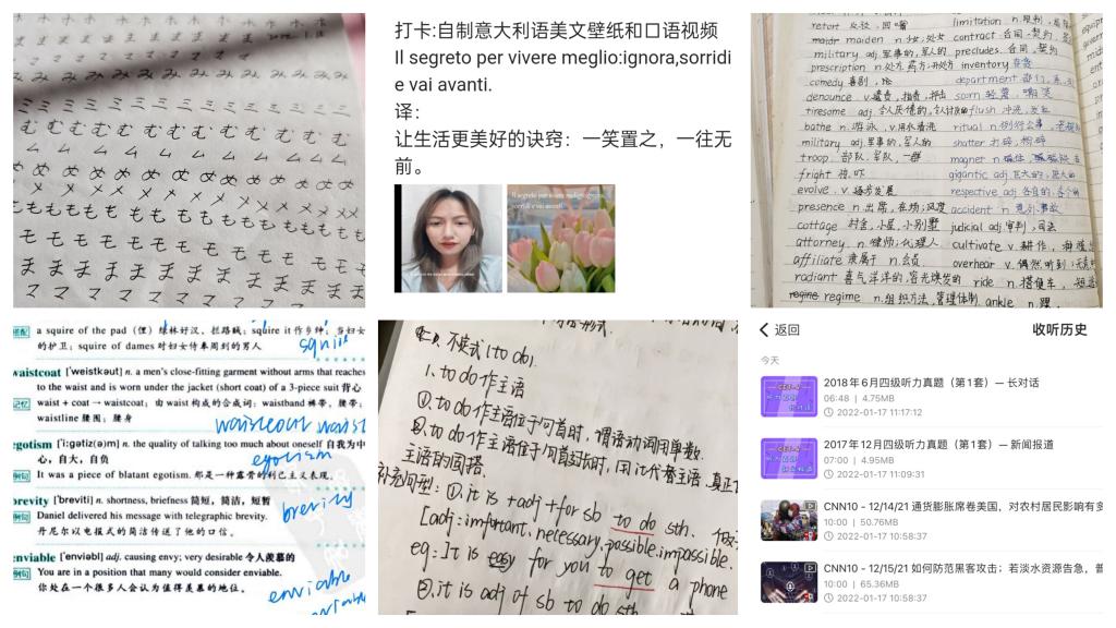 在本期“小伙伴計劃”中,外語計劃在開始之際即穩步進行,并于2月10日順利結束。參與外語計劃的“小伙伴”們通過各式各樣的學習方法進行打卡,包括背單詞、學語法、練口語等。活動過程中,“小伙伴”們因擁有相同的目標而結識,并自主結成伙伴進行外語的學習與探討,部分“小伙伴”在活動開始前就已養成自覺學習外語的好習慣,在過年期間仍會抽出一定時間進行外語學習和鞏固,表現出了對外語學習的極大熱情。