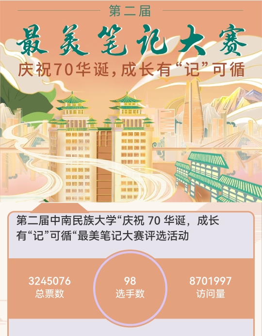 網絡投票從10月4日開始,持續一周,每人每天可投5票。網絡投票地址通過“中南民族大學”“資訊民大”兩個公眾號發布。經過激烈角逐,教育學院唐匯苓(95297票)、音樂舞蹈學院蔡孟圓(93525票)和管理學院劉璇(91516票),分別位列網絡評選排行榜前三名。目前,網絡評選已進入專家評審階段。