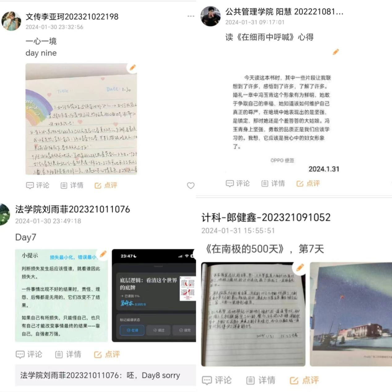 閱讀計劃以名著閱讀打卡為基本內容,同學們需將每天的閱讀內容進行匯總,以摘抄名句、寫閱讀心得等形式進行成果反饋。書中藏智慧,閱讀伴成長。閱讀是心靈的旅行,能讓同學們收獲更好的自己。來自文傳學院的李亞柯同學表示:”無論是電子書還是實體書,閱讀的過程都讓我十分專注,仿佛外界紛擾與我無關,沉浸在文字的世界是幸福的。讀書是一種享受,更是一種成長。希望更多的同學都能加入養成良好閱讀習慣的行列中來,一起感受文字的魅力。