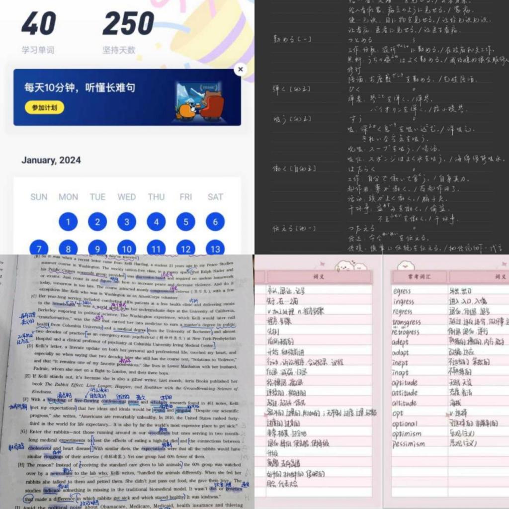 筆記計劃鼓勵大家利用假期自主學習學科專業知識,同學們可以通過閱讀、刷題、上網課等方式開展學習活動,并將學習成果以筆記的形式展現,標注日期,拍照上傳至打卡圈。活動開展以來,同學們遵循活動細則,選擇了多樣的學習內容,筆記打卡內容詳盡細致,頁面整潔。筆記不僅是知識的整理,更是對學習過程的深層理解。每一次對筆記的總結反思,都是對自我學識沉淀的審視,使得學到的知識更具實際應用價值。通過筆記計劃,同學們合理利用假期,加深了對所學專業知識的理解,養成了良好的學習習慣。