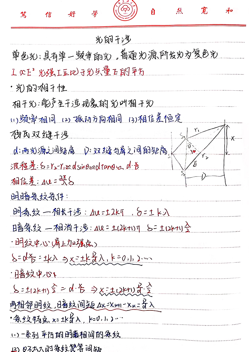 紙質(zhì)筆記的關(guān)鍵是:1、內(nèi)容要足夠重點,而重點主要來源于章節(jié)總結(jié)、習(xí)題作業(yè)等。2、精簡但不失細節(jié)。一些容易混淆的概念或特點,可以列出來一一比對,方便記憶。3、規(guī)劃合理。我的筆記結(jié)構(gòu)是左邊為圖,右邊或底部為計算過程和講解。重點、例題用亮色筆或圖案標(biāo)記,在復(fù)習(xí)時一目了然。
