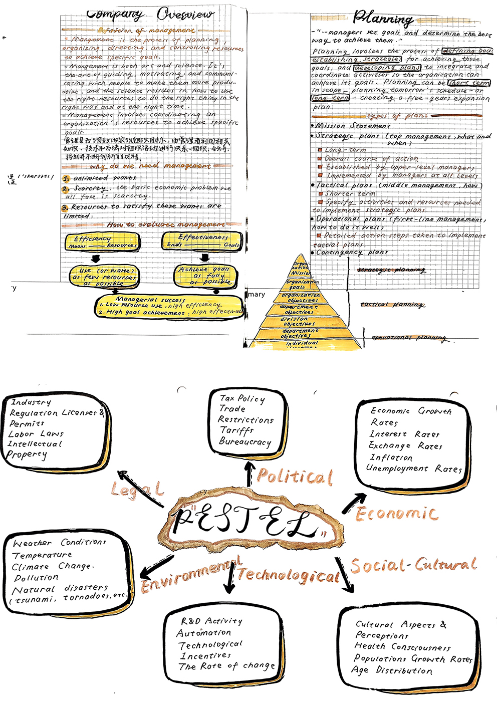 將老師的PPT和書本上的內(nèi)容相結(jié)合來制作筆記,既有重點難點又覆蓋全面。同時我還會在筆記上畫一些簡筆畫,添加一些色彩,不僅讓筆記賞心悅目,而且能夠放松身心,激勵自己下一步的學(xué)習(xí)。