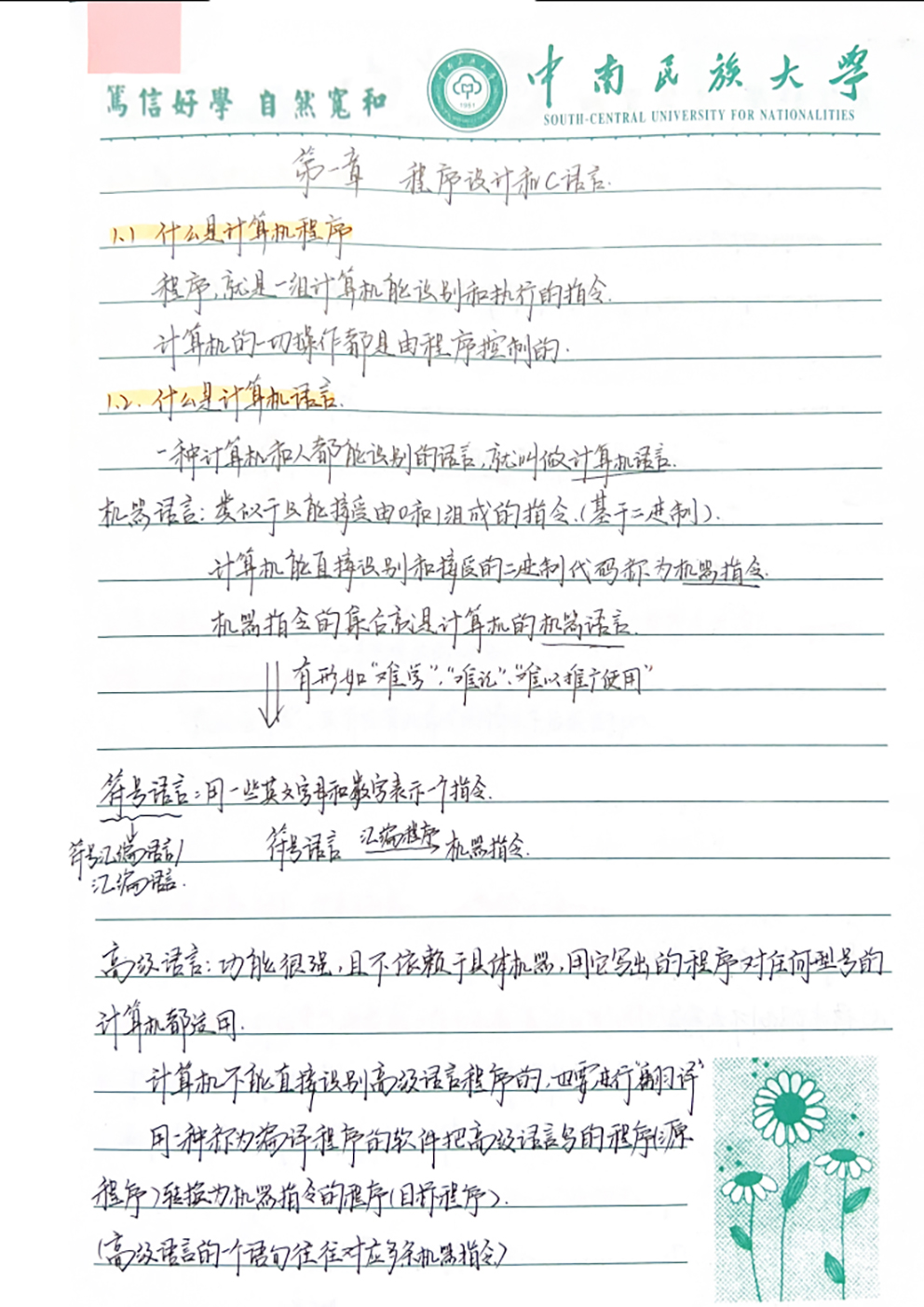 理論課是及時記錄老師講解的重點,編程課是在完成相關(guān)實驗之后,結(jié)合課上的重點例題和解題方法總結(jié)成筆記。其中,編程課知識點比較多,對于相似的知識點我會用同一顏色標(biāo)注,在每一個知識點下面舉例子,以此來方便理解。