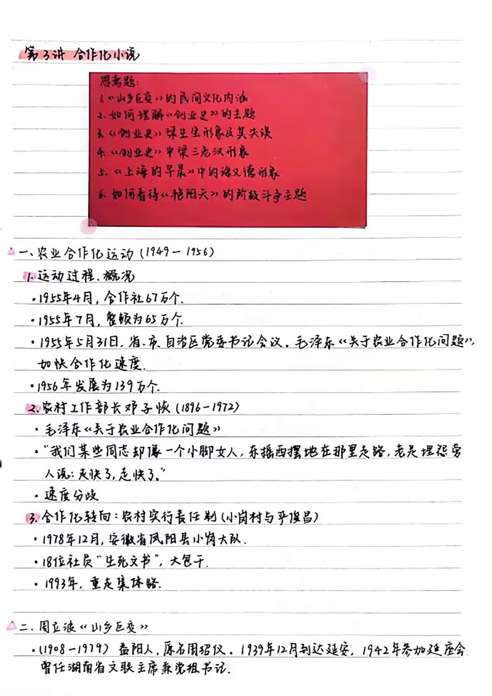 我認為做筆記要注意以下幾點:1、不能大篇幅抄寫資料上淺顯易懂的知識,應(yīng)該對考點和重難點加以思考和總結(jié);2、使用高亮筆進行重點標(biāo)記;3、字跡清晰,方便后續(xù)的復(fù)習(xí)理解;4、頁面整潔,按照自己的審美進行排版。