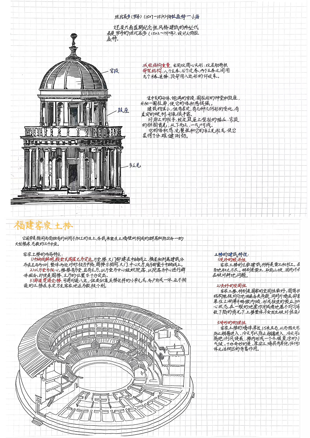 對《中外建筑史》課堂的重點內(nèi)容進行手繪,同時配以文字,做到圖文結(jié)合,非常便于理解、記憶和復(fù)習(xí)。在做筆記時,我常使用活頁紙、方格紙和彩繪鉛筆:活頁紙便于書寫,方格紙便于繪圖,使用彩繪鉛筆對建筑涂色可以讓畫面更加豐富多彩。