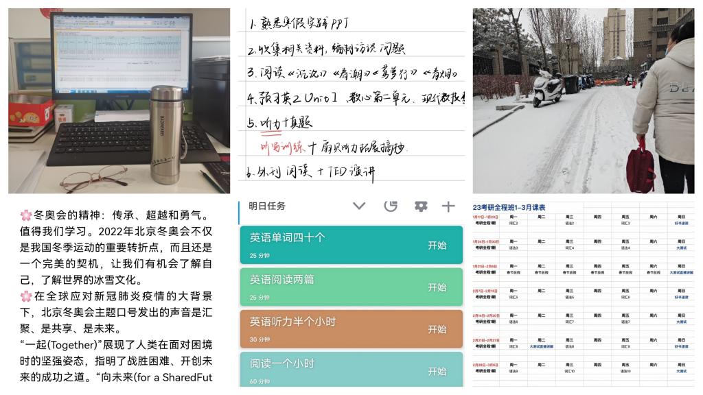 活動期間,即使是嚴寒的冬天,“小伙伴”們也堅持早起,進行了豐富多彩的有益身心的活動,用背單詞、遛狗、早起一杯熱水、健身房鍛煉等不同方式來開啟美好的一天。同時,在早睡打卡部分中,“小伙伴”們也用心記錄了自己一天的收獲并制定了第二天的學習計劃,內容包含了對自己的鼓勵與未來的期待。