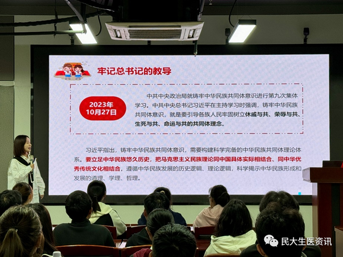 在集中觀看了習(xí)近平總書記在中共中央政治局第九次集體學(xué)習(xí)時(shí)的重要講話精神專題學(xué)習(xí)視頻后,葉穎向入黨積極分子講解了習(xí)近平總書記關(guān)于鑄牢中華民族共同體意識(shí)重要講話的精神內(nèi)涵和重要意義,從黨史中的民族團(tuán)結(jié)小故事出發(fā),介紹了自中國(guó)共產(chǎn)黨成立以來,我們黨在民族團(tuán)結(jié)與平等、發(fā)展民族地區(qū)經(jīng)濟(jì)、改善民族地區(qū)教育文化等方面出臺(tái)的方針政策,強(qiáng)調(diào)了在新征程上我們黨的民族工作面臨的新的形勢(shì)和任務(wù)。同時(shí),結(jié)合習(xí)近平總書記提出的“鑄牢中華民族共同體意識(shí),要立足中華民族悠久歷史,把馬克思主義民族理論同中國(guó)具體實(shí)際相結(jié)合、同中華優(yōu)秀傳統(tǒng)文化相結(jié)合”的重要論斷,葉穎闡述了中華民族自古以來包容、自信、開放的文化特征,指出了“民族的”才是“世界的”中華優(yōu)秀傳統(tǒng)文化,鼓勵(lì)同學(xué)們要開拓眼界,深刻理解中華民族發(fā)展的歷史邏輯、理論邏輯,樹立遠(yuǎn)大目標(biāo),勤奮學(xué)習(xí),腳踏實(shí)地,為強(qiáng)國(guó)建設(shè)、民族復(fù)興凝聚青春力量。